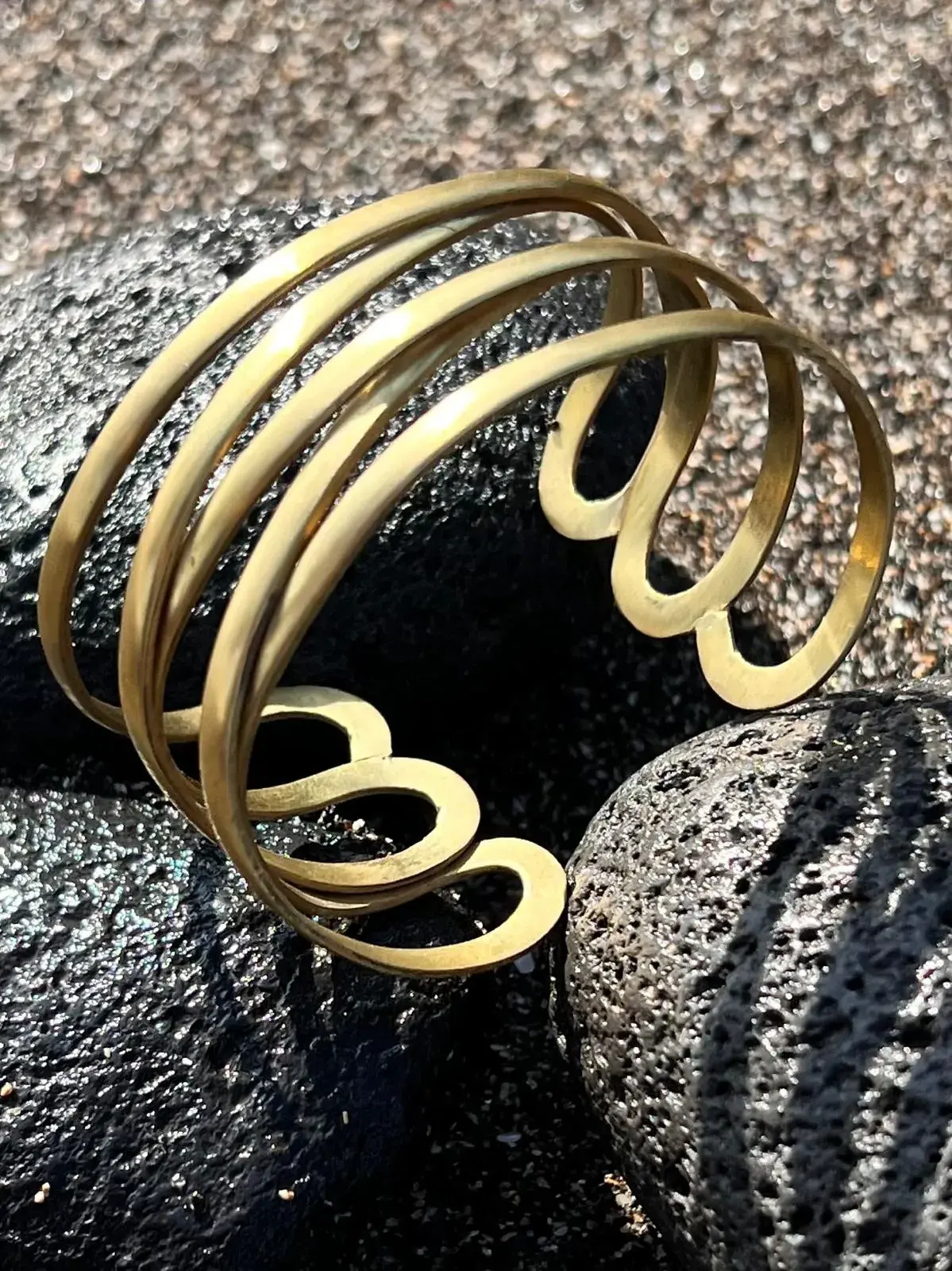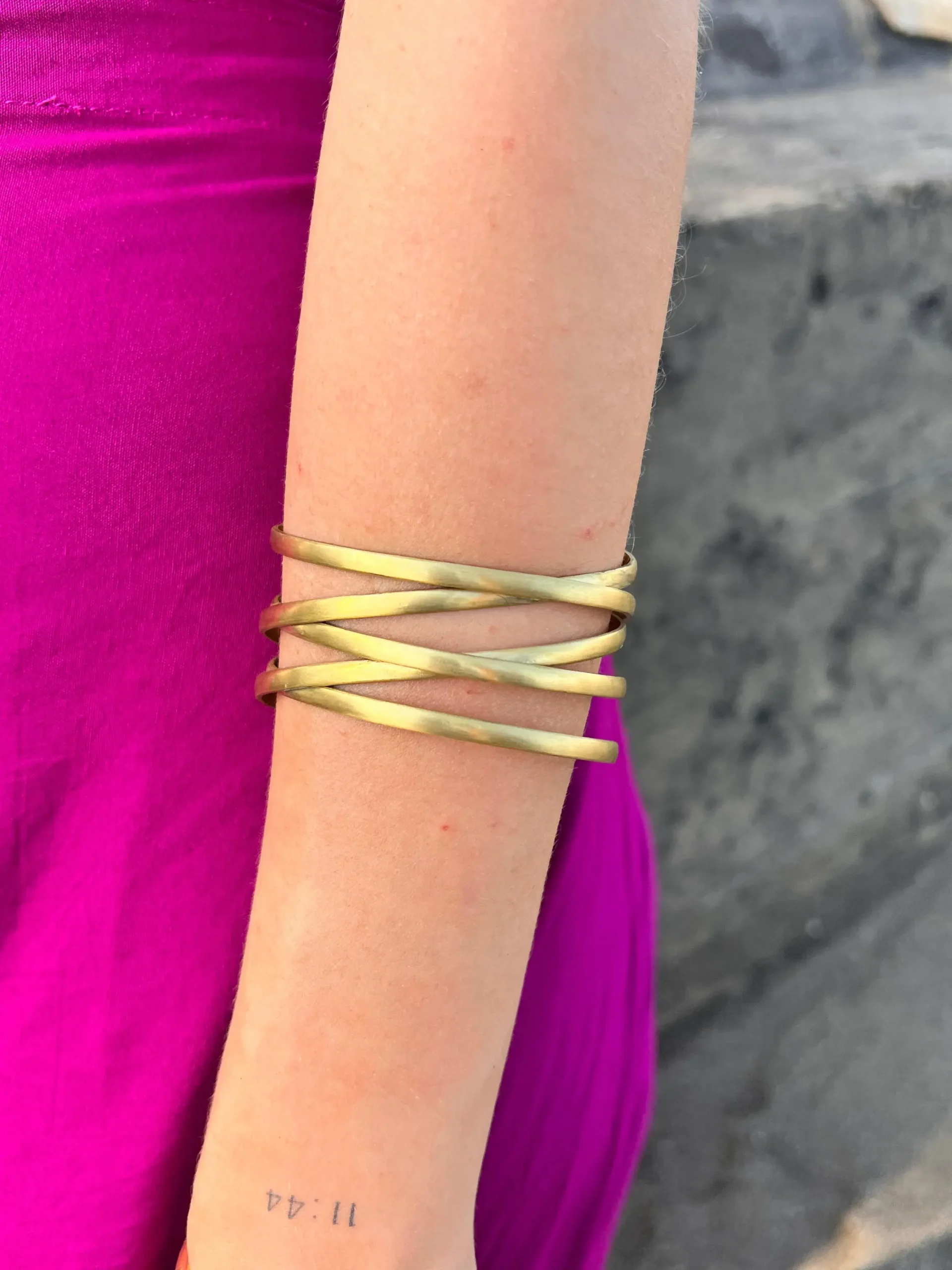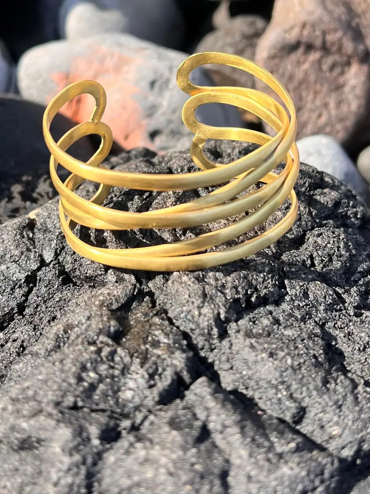 Dieser Armreif ist mehr als ein Schmuckstück- er ist ein Zeichen. Für das, was uns verbindet: mit unseren Wurzeln, unseren Visionen, unseren Mitmenschen. Die geschwungenen, goldmatten Linien symbolisieren Wege, die sich kreuzen- wie Begegnungen im Leben. Wie Gedanken im Leben, die sich verweben. Wie Energien, die zueinander finden. Trage deine Verbindung sichtbar. Bleibe verbunden- mit dir selbst und der Welt.
